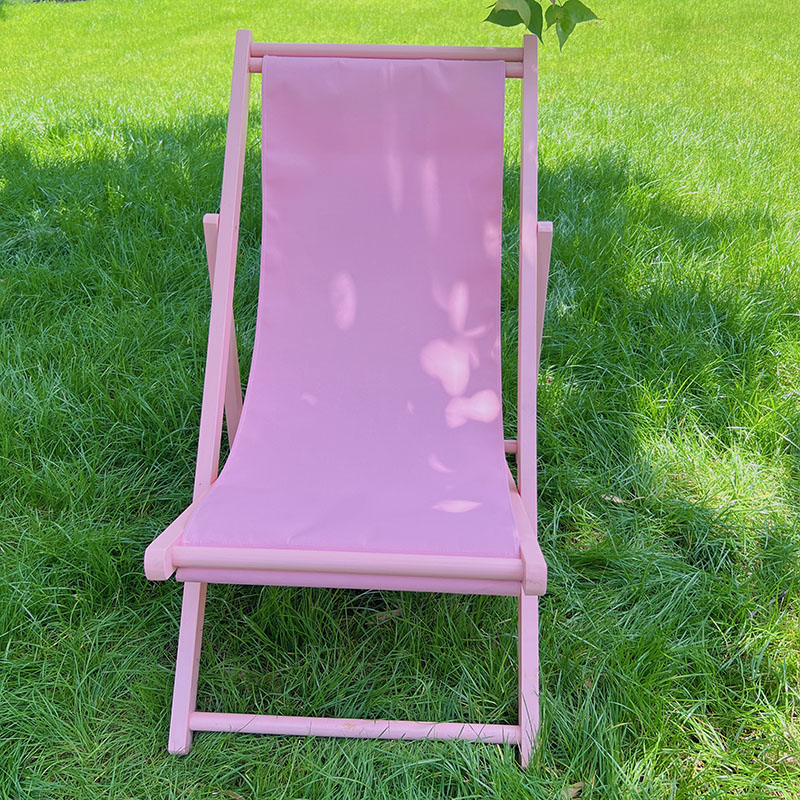 Soft pink folding deck chair, durable and portable for outdoor use.
